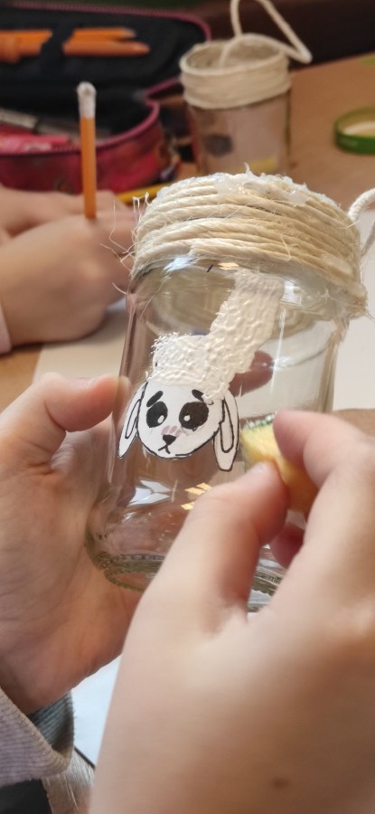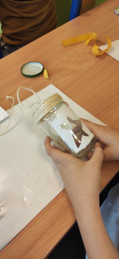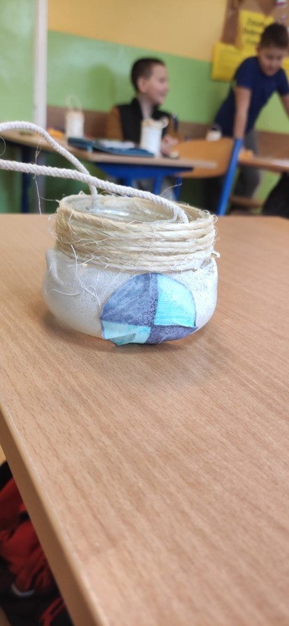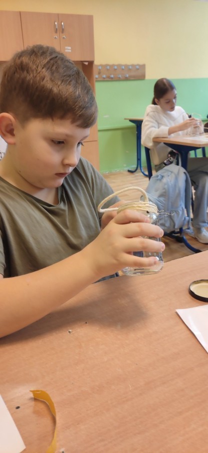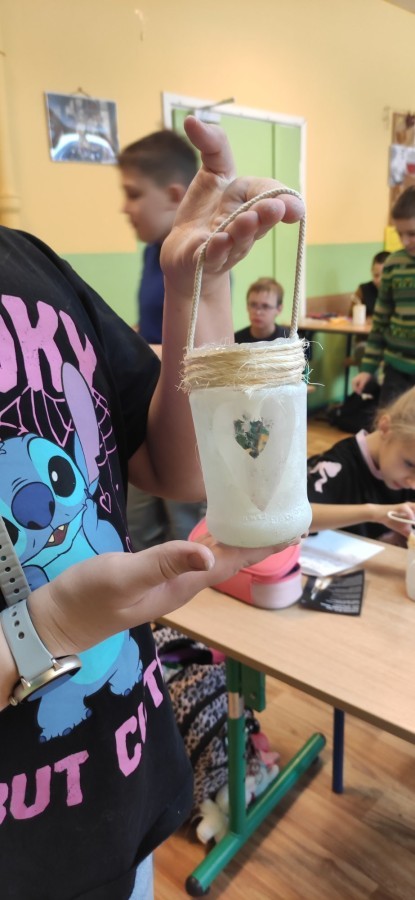 W listopadzie uczniowie kl. 4c brali udział w warsztatach ekologicznych prowadzonych przez firmę FLOJAMO i wykonali ozdobne lampiony, wykorzystując do tego niepotrzebne słoiki, sznurek sizalowy i farby plakatowe. Dzieci wykazały się pomysłowością w ozdabianiu swoich prac.
