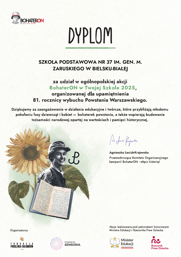 Nasza szkoła otrzymała dyplom uczestnictwa w akcji BohaterON w Twojej Szkole 2025. Akcja ta upamiętniła 81. rocznicę wybuchu Powstania Warszawskiego.