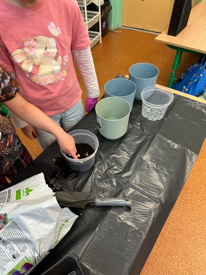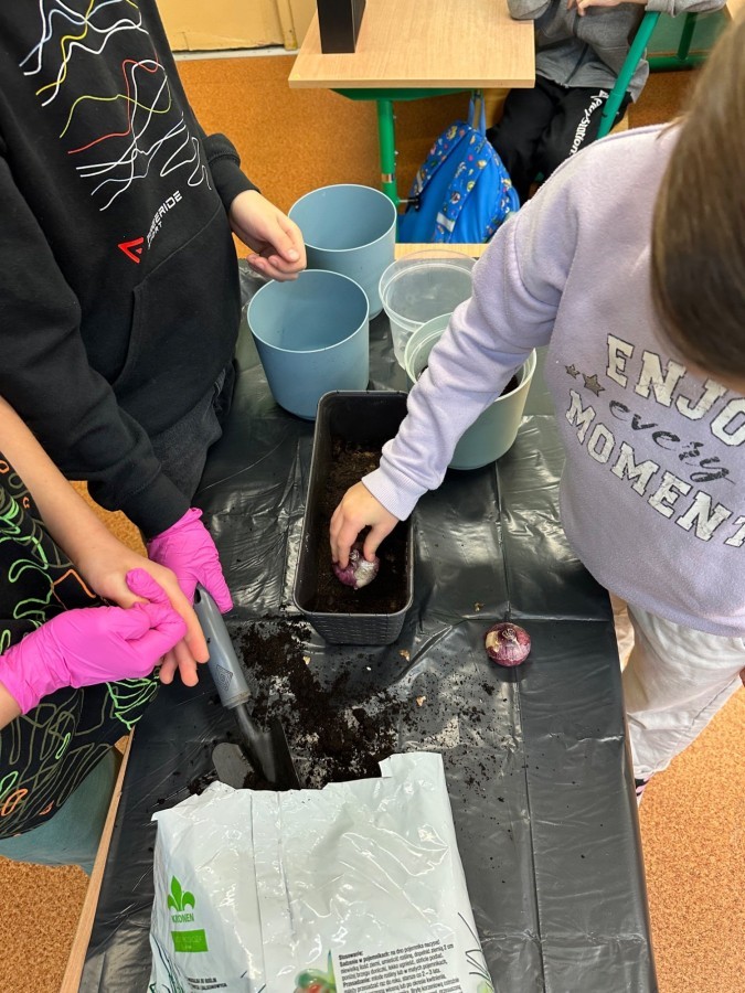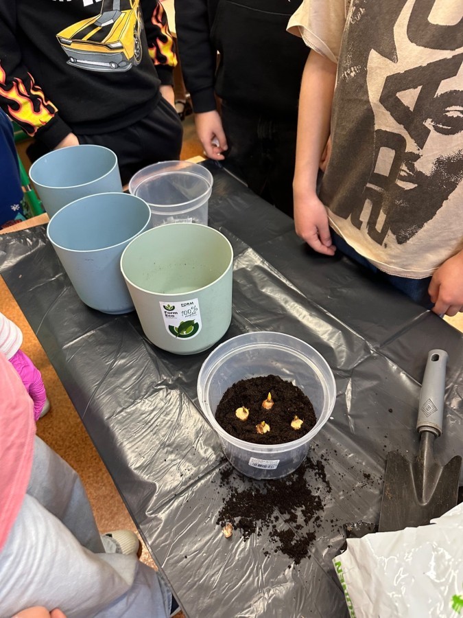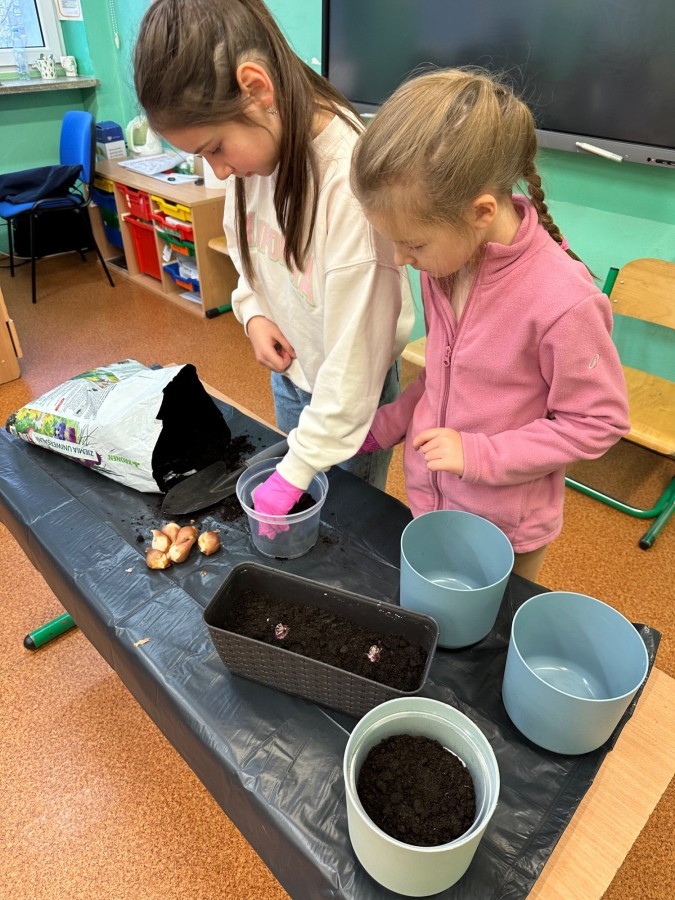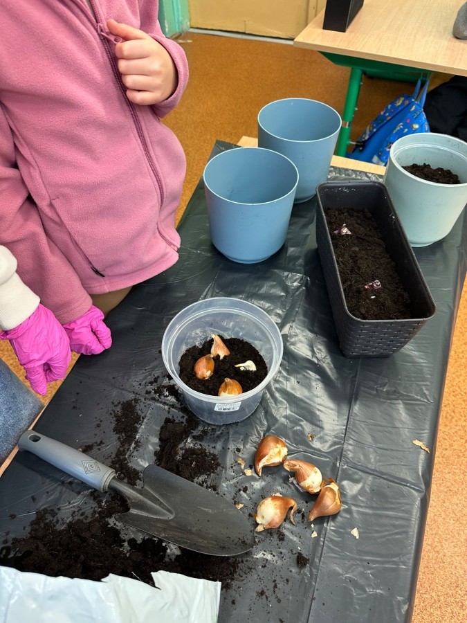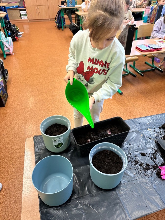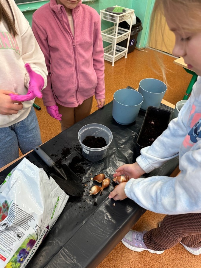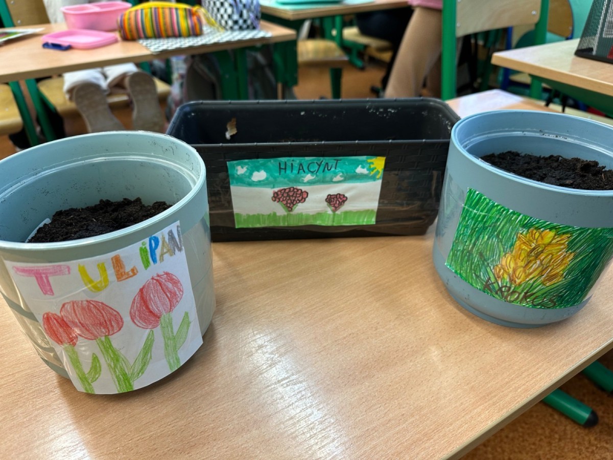 W listopadzie w ramach działań ogrodniczych klasa 2b założyła mini ogródek kwiatowy. Uczniowie posadzili w doniczkach cebulki kwiatowe (hiacynty, krokusy i tulipany).