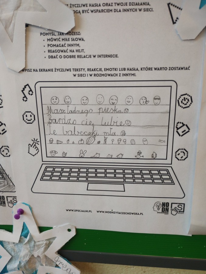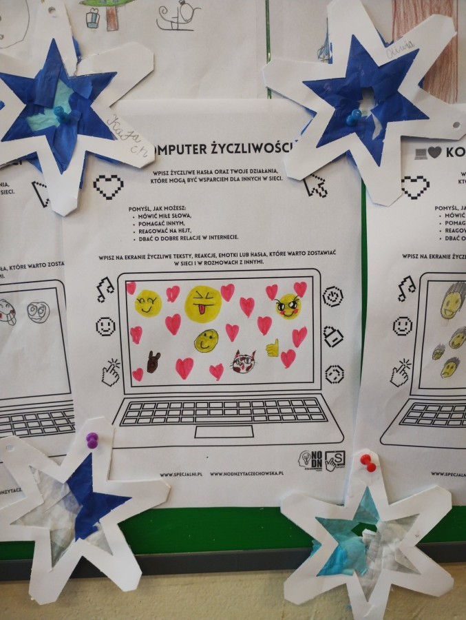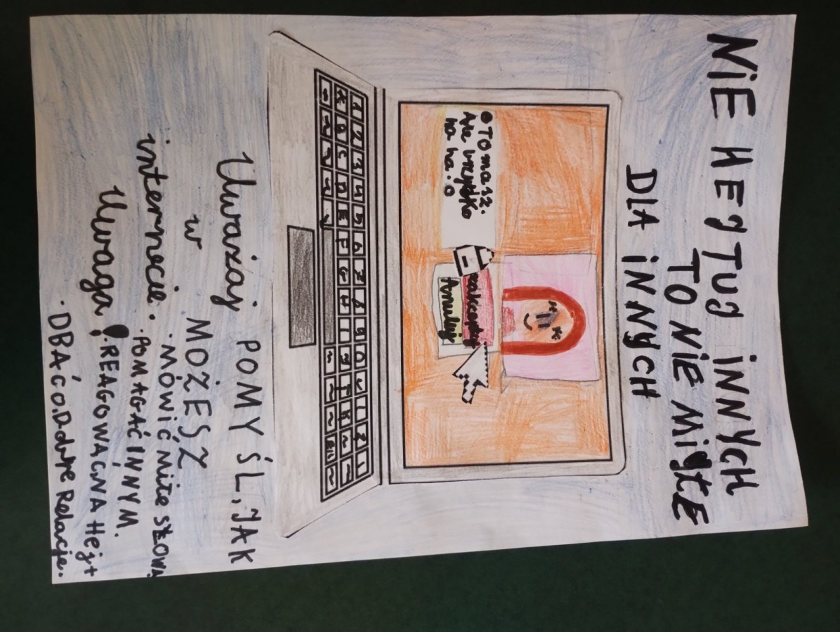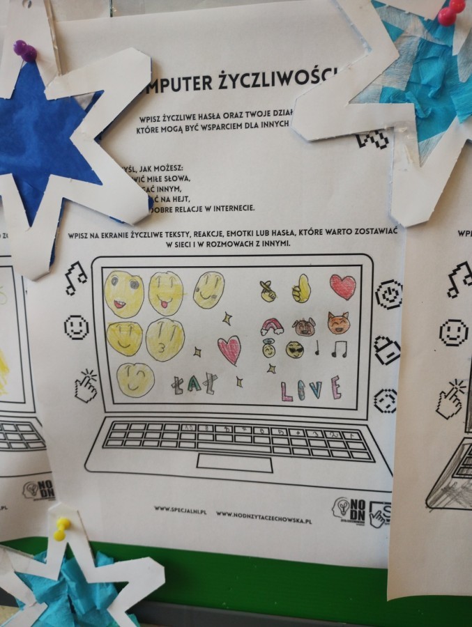 Równolegle rozpoczęliśmy działania dotyczące bezpieczeństwa w sieci, mówiąc STOP wszelkim formom hejtu. W ramach Dnia Bezpiecznego Internetu odbyły się konkursy plastyczne w klasach młodszych oraz quizy wiedzy w klasach starszych. Uczniowie oglądali filmiki, rozmawiali z nauczycielami o bezpiecznym korzystaniu z Internetu i właściwym zachowaniu online. W niektórych klasach na gazetkach zawisły „Komputery życzliwości”, pokazujące, że każde słowo wpisane w sieci ma znaczenie – tak samo jak słowo wypowiedziane twarzą w twarz.