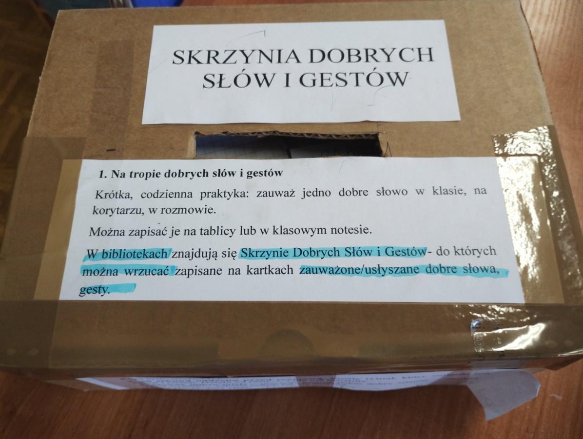 W szkolnych bibliotekach pojawiły się Skrzynie Dobrych Słów i Gestów, do których uczniowie wrzucali zapisane na kartkach zauważone lub usłyszane dobre słowa oraz miłe gesty.