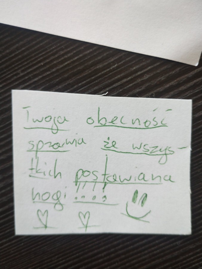 Była to krótka, codzienna praktyka uważności – uczniowie starali się zauważyć jedno dobre słowo lub gest w klasie, na korytarzu czy w rozmowie z innymi. Celem działań było wzmacnianie życzliwości, empatii i pozytywnej komunikacji w szkolnej codzienności.