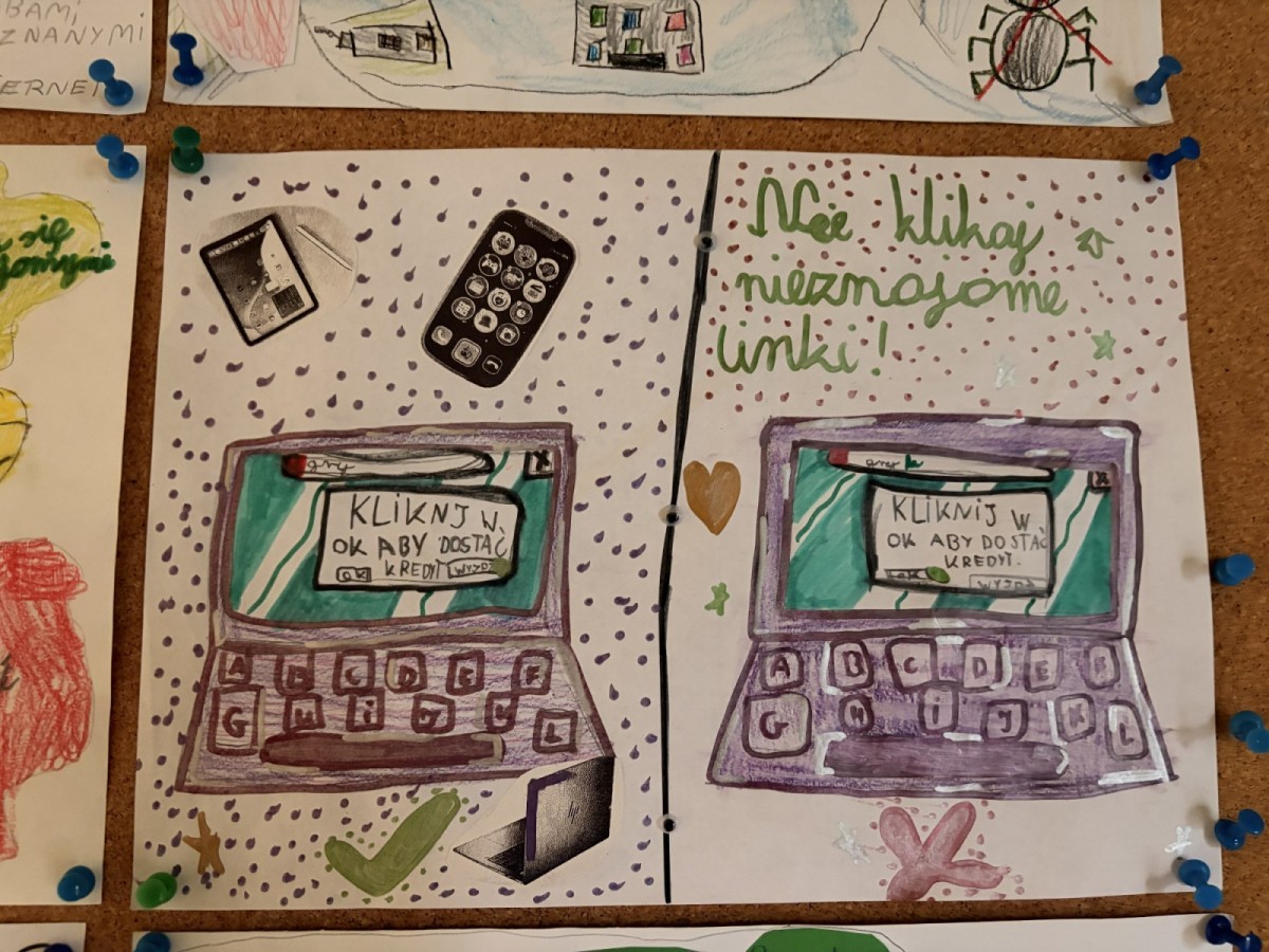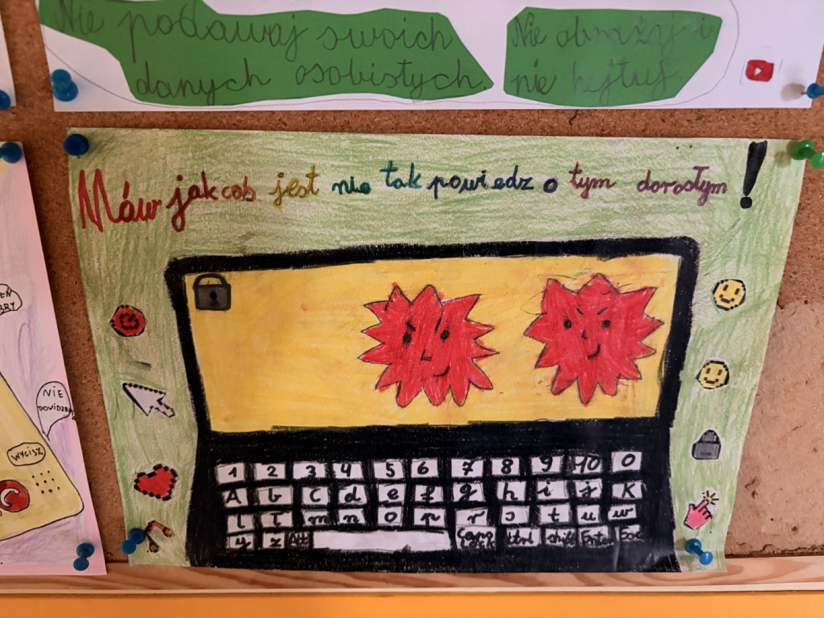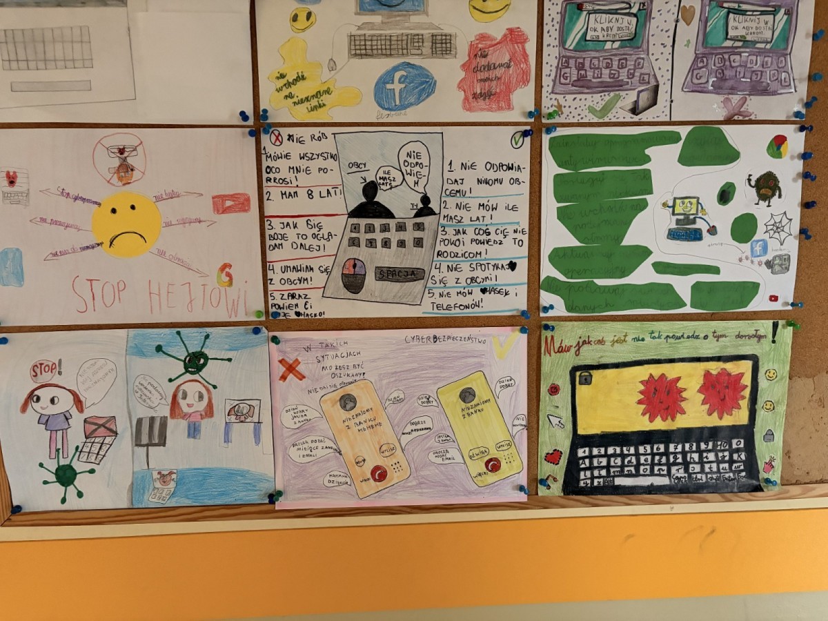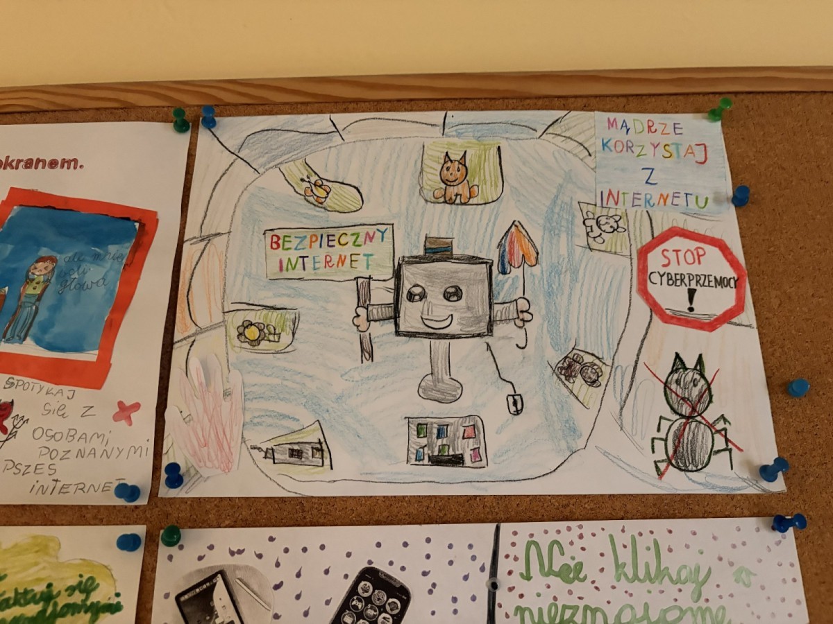 W lutym w naszej szkole został zorganizowany konkurs plastyczny pt. „Cyberbezpieczeństwo w ramach przeciwdziałania zachowaniom przemocowym w sieci”, skierowany do uczniów klas I–III.