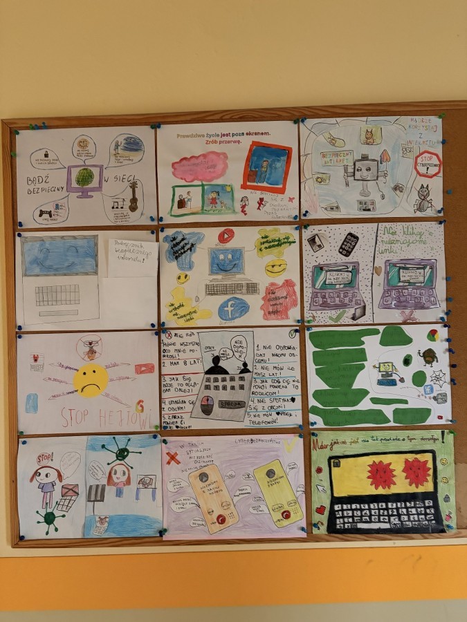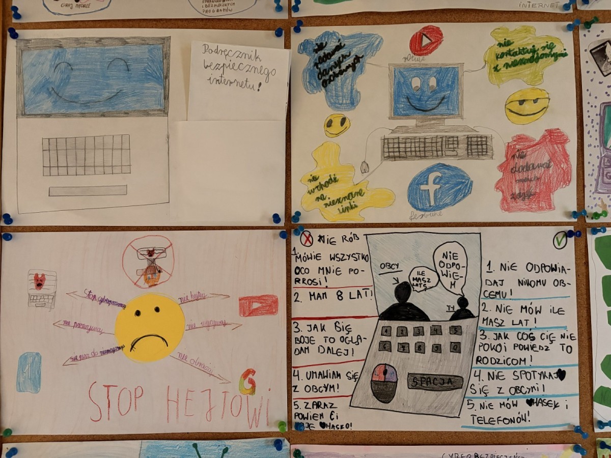 Uczniowie przygotowali kreatywne prace plastyczne, w których przedstawili swoje spojrzenie na zasady bezpiecznego poruszania się w sieci. Wykazali się dużą pomysłowością, wrażliwością oraz zrozumieniem omawianej tematyki.