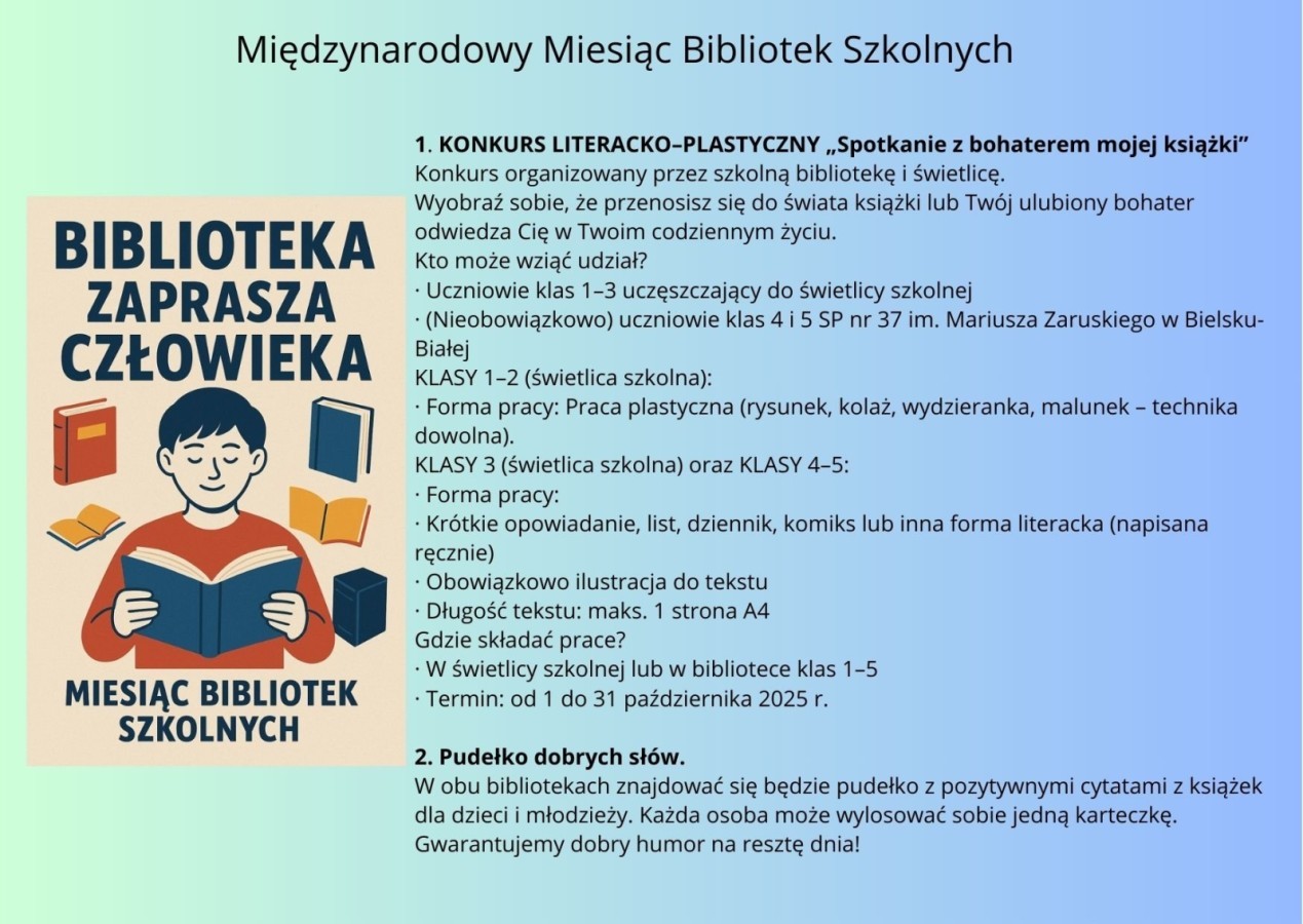 Z okazji Międzynarodowego Miesiąca Bibliotek Szkolnych, którym jest październik, biblioteka szkolna zorganizowała dwie propozycje czytelnicze dla uczniów, w tym jedna to konkurs: