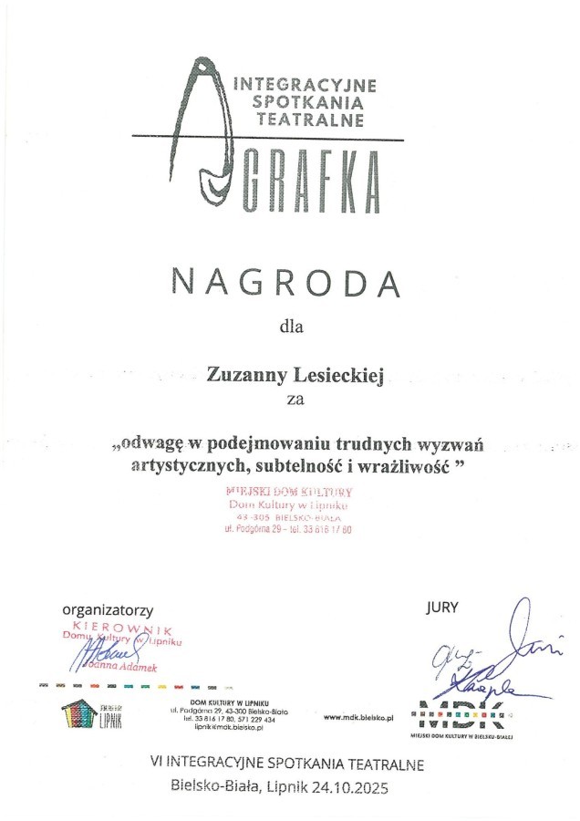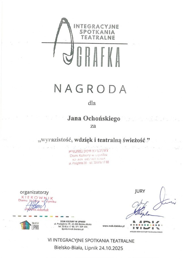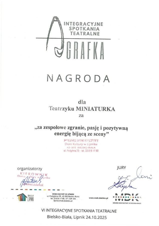 Zespół teatralny MINIATURKA za spektakl "Uwierz w siebie, czyli historia kotki Kłębuszki" oraz monodramiści z 3 klasy otrzymali finansowe nagrody od szanownego Jury Spotkań Teatralnych. Jak napisano na stronach Domu Kultury LIPNIK: cyt. " Teatr znów połączył ludzi — młodych, wrażliwych, odważnych. Podczas tegorocznej AGRAFKI scena stała się po raz szósty miejscem spotkania dzieci, młodzieży i zespołów integracyjnych, które udowodniły, że sztuka nie zna granic. Było wzruszająco, pięknie i prawdziwie. Dziękujemy profesjonalnemu Jury w składzie: Karolina Czapla, Eugeniusz Jachym, Władysław Aniszkiewicz — którzy z sercem, z czułością i uwagą ocenili młodych artystów. AGRAFKA to dowód na to, że scena jest miejscem, gdzie można powiedzieć o świecie coś prawdziwego. Za odwagę. Za wrażliwość. Za piękno."