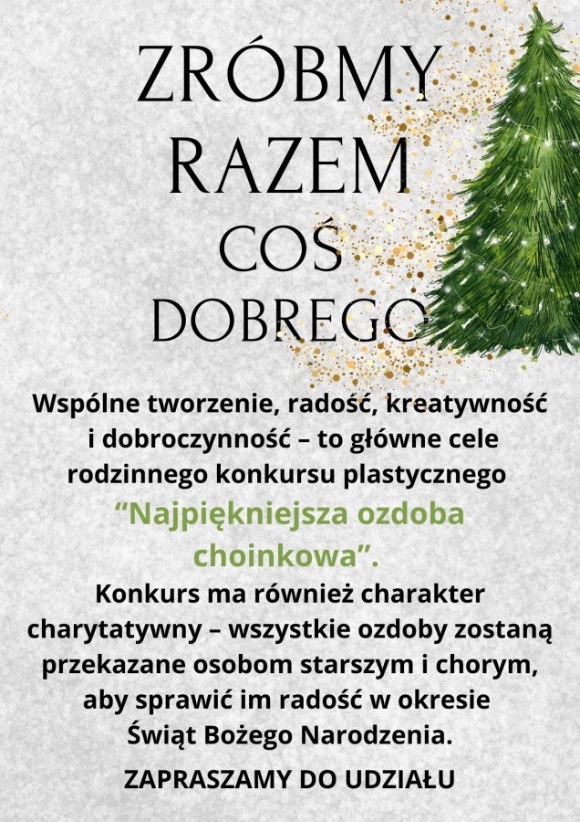 Wspólne tworzenie, radość, kreatywność i dobroczynność – to główne cele rodzinnego konkursu plastycznego „Najpiękniejsza ozdoba choinkowa”. Konkurs ma również charakter charytatywny – wszystkie ozdoby zostaną przekazane osobom starszym i chorym, aby sprawić im radość w okresie Świąt Bożego Narodzenia.