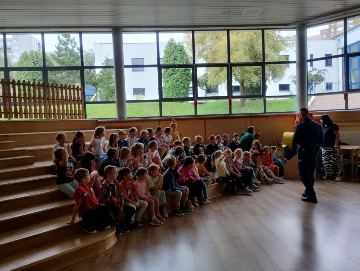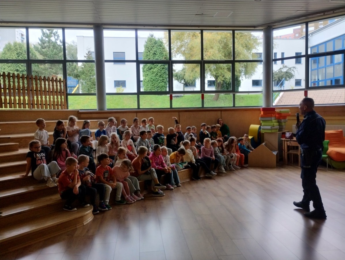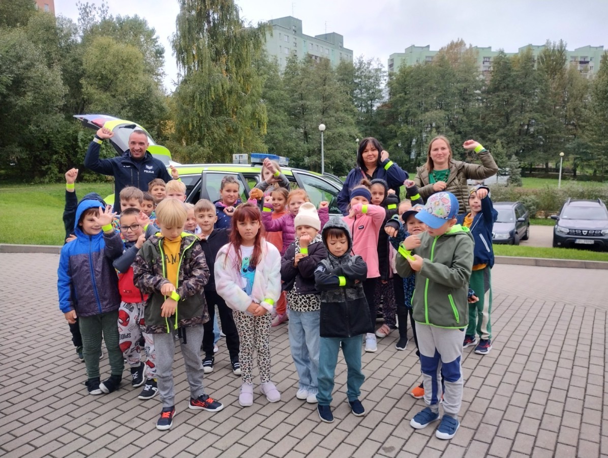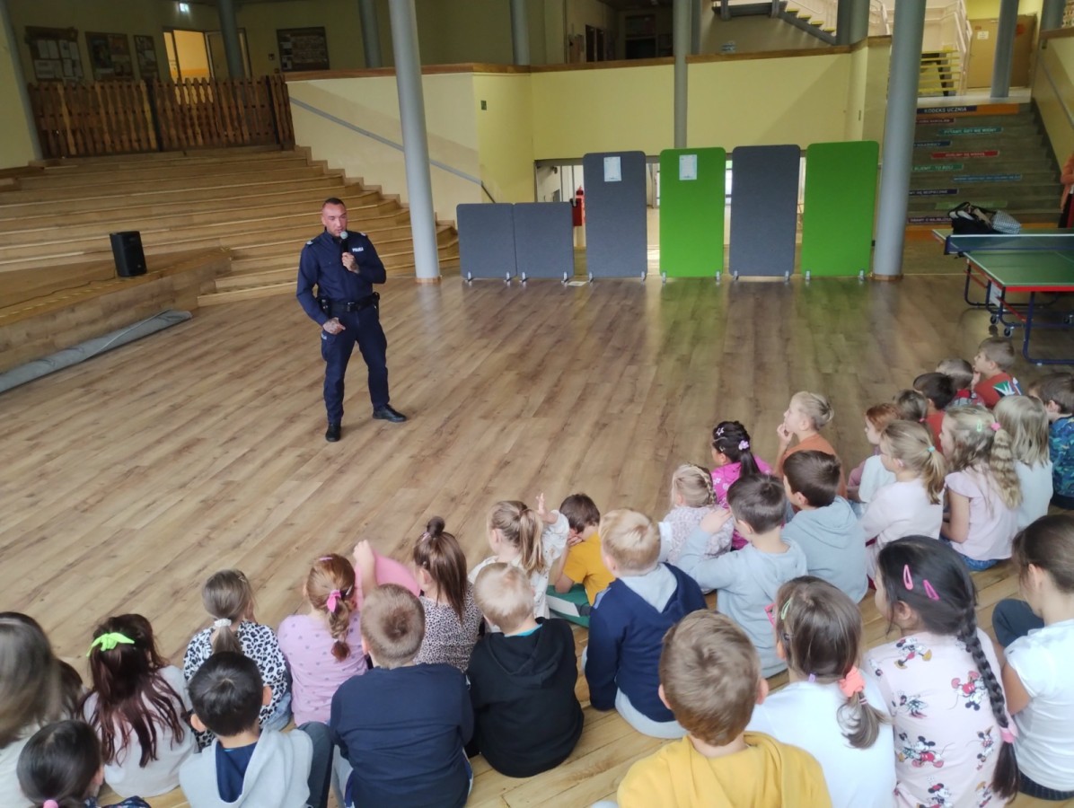 Pan dzielnicowy omówił zasady bezpiecznego poruszania się po drodze oraz reagowania w sytuacji zagrożenia. Zwrócił uwagę na to, jak ważne są kaski podczas jazdy na rowerze i hulajnodze.