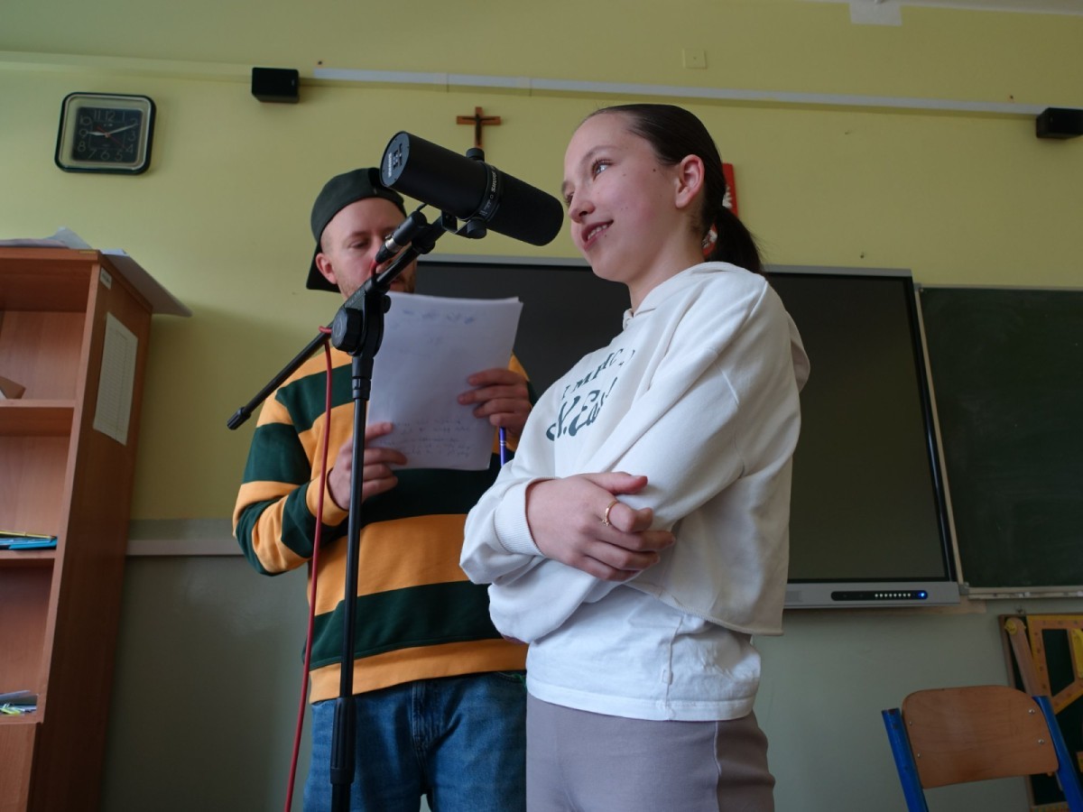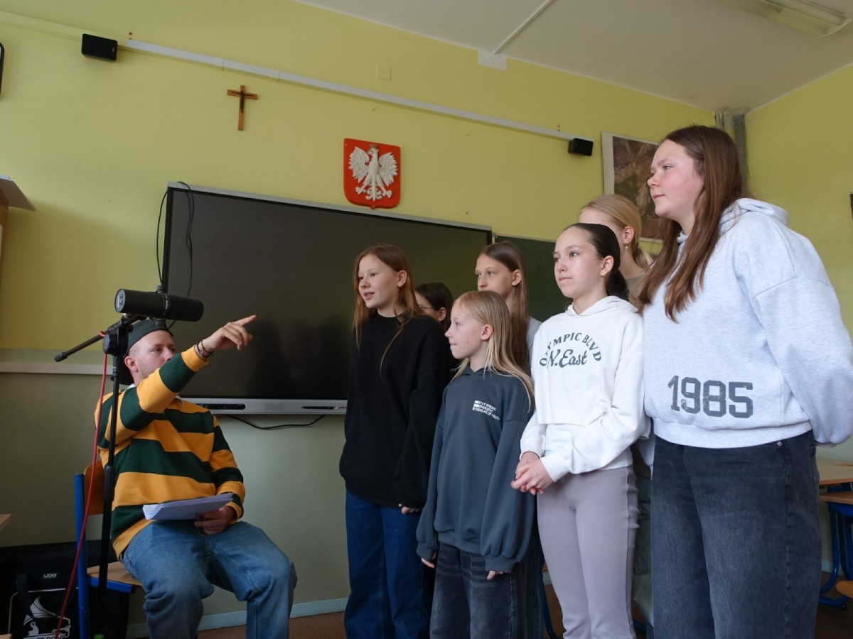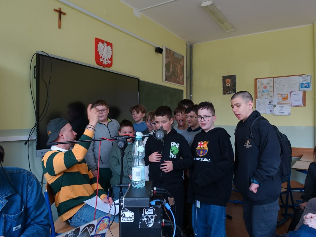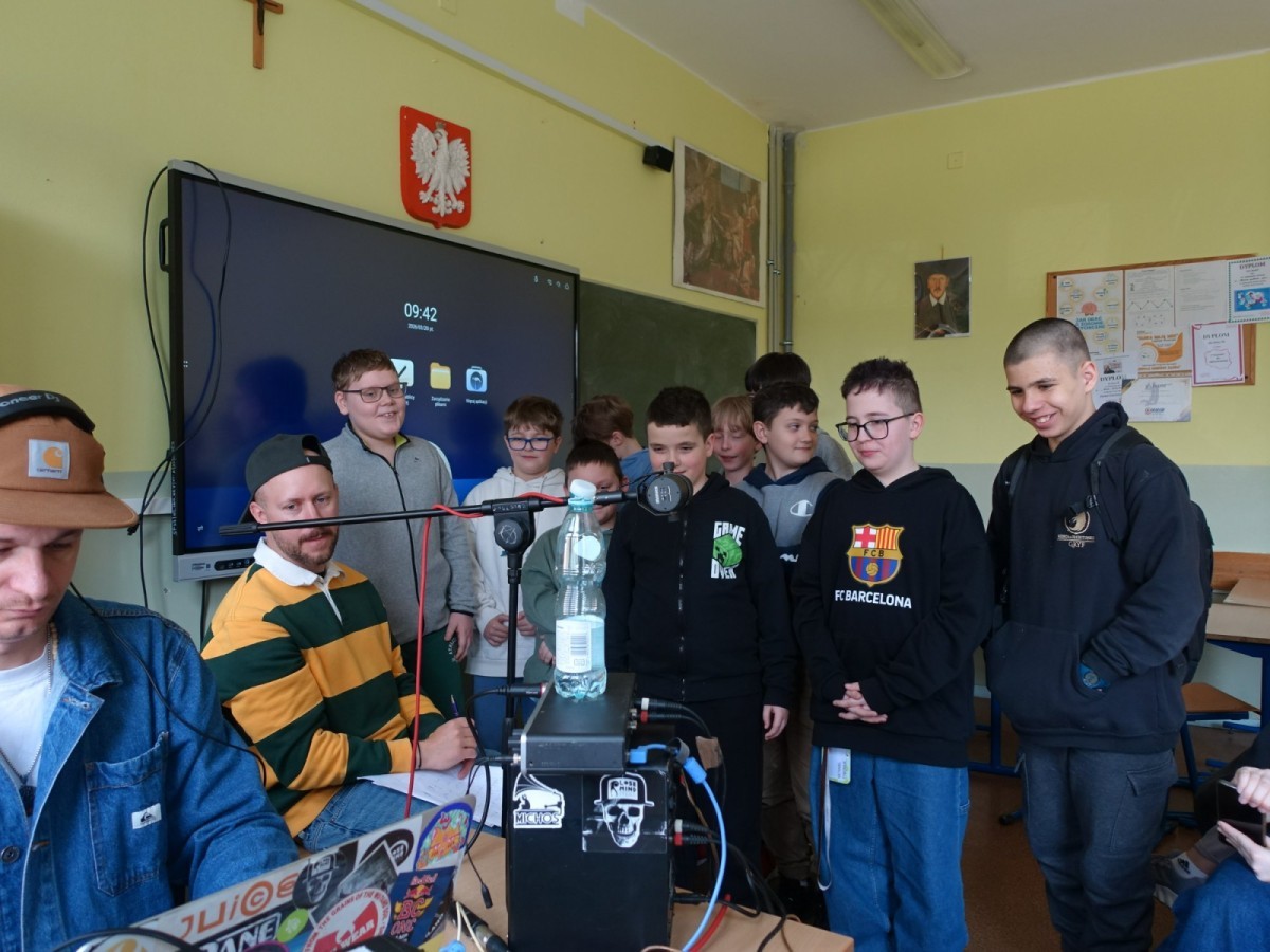 Podczas spotkania uczniowie mieli okazję poznać kulisy pracy artysty, a przede wszystkim sami spróbować swoich sił w tworzeniu muzyki. Współtworzyli teksty, eksperymentowali ze słowem i rytmem, a następnie nagrywali utwory.