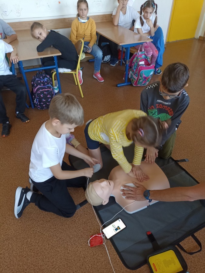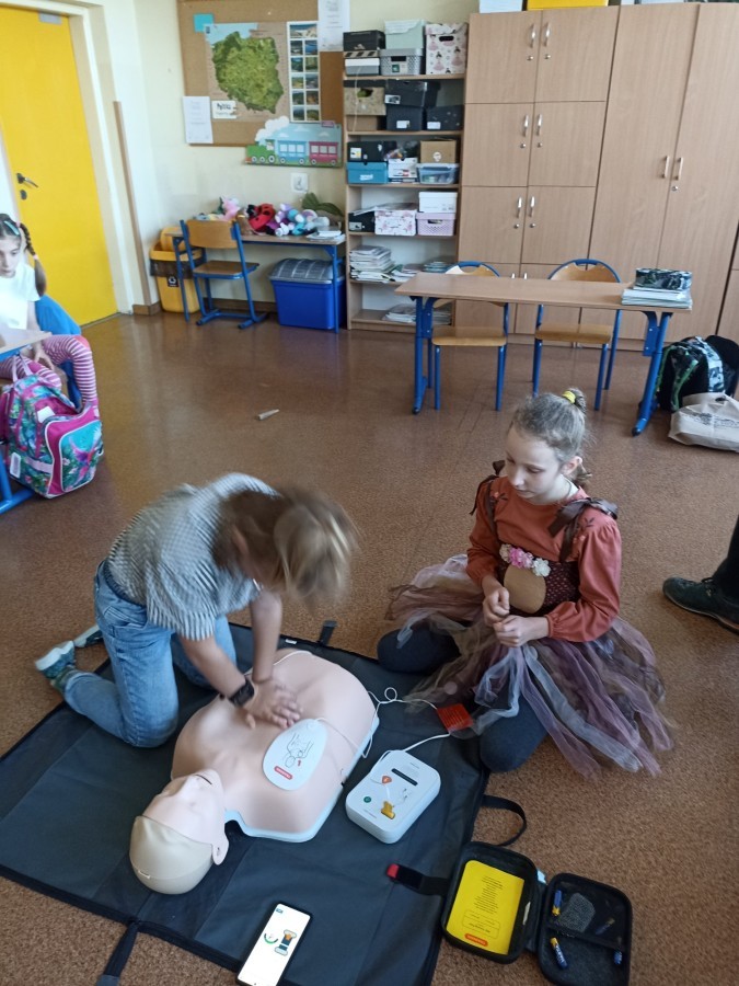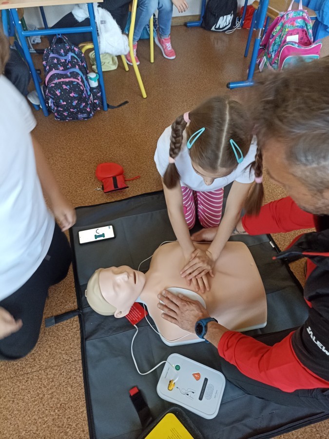 Prowadzący w przystępny i ciekawy sposób zaprezentował podstawowe czynności ratownicze, takie jak sprawdzanie przytomności i oddechu oraz podstawy resuscytacji krążeniowo-oddechowej. Uczniowie zapoznali się z działaniem AED, czyli Automatycznego Defibrylatora Zewnętrznego. Wszyscy mieli możliwość aktywnego udziału w zajęciach ćwicząc zdobyte wiadomości na fantomie, z zastosowaniem AED.